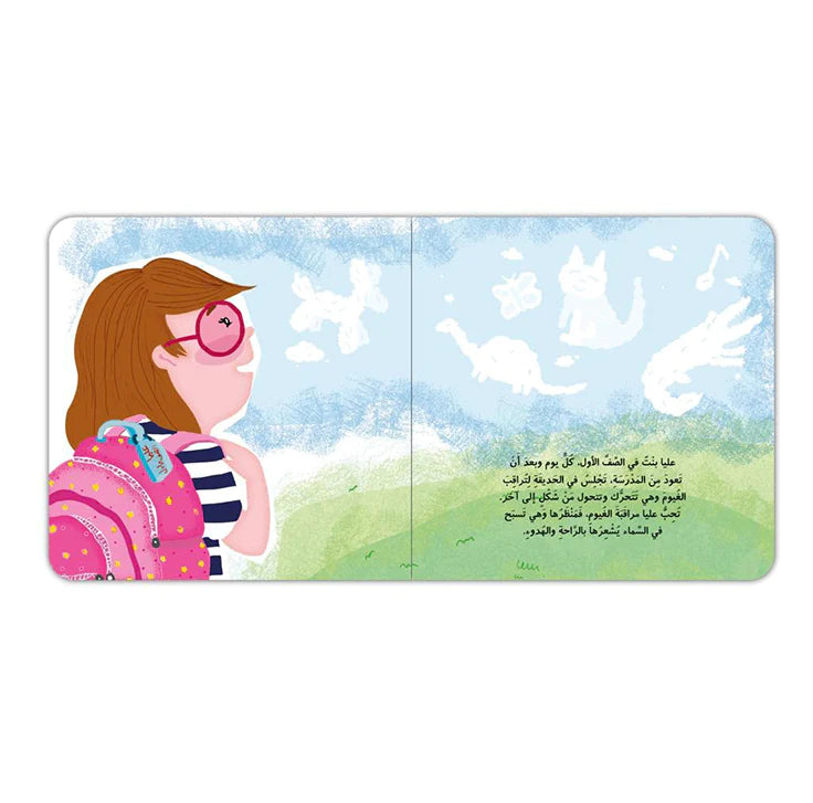 وَجَدتْ عليا بِأسلوبها الخَاصِّ طَريقَةً تَتَكيَّفُ بِها مَع مَشاعِرِهاالمُتقلِّبَة كَتَقلُّب شكل الغُيوم في السّماءِ، تُدْرِكُ عليا أَنَّالمَشاعِرَ مُتَغيِّرةٌ وَعابِرةٌ تماماً كالغُيومِ، فبعضها أبيضٌ لطيفٌ، وبعضُهارماديٌّ كثيفٌ يَحْجُبُ الرّؤية، و مِنها ما هو مُشَتَّتٌ و غير متناسِق، و لكن لدينا أيضًا تلك الغُيوم الجَميلة الّتي