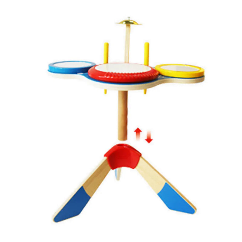 Get drumming with this triple drum set with cymbal! Just the right height for children, it includes two easy-grip drum sticks.
