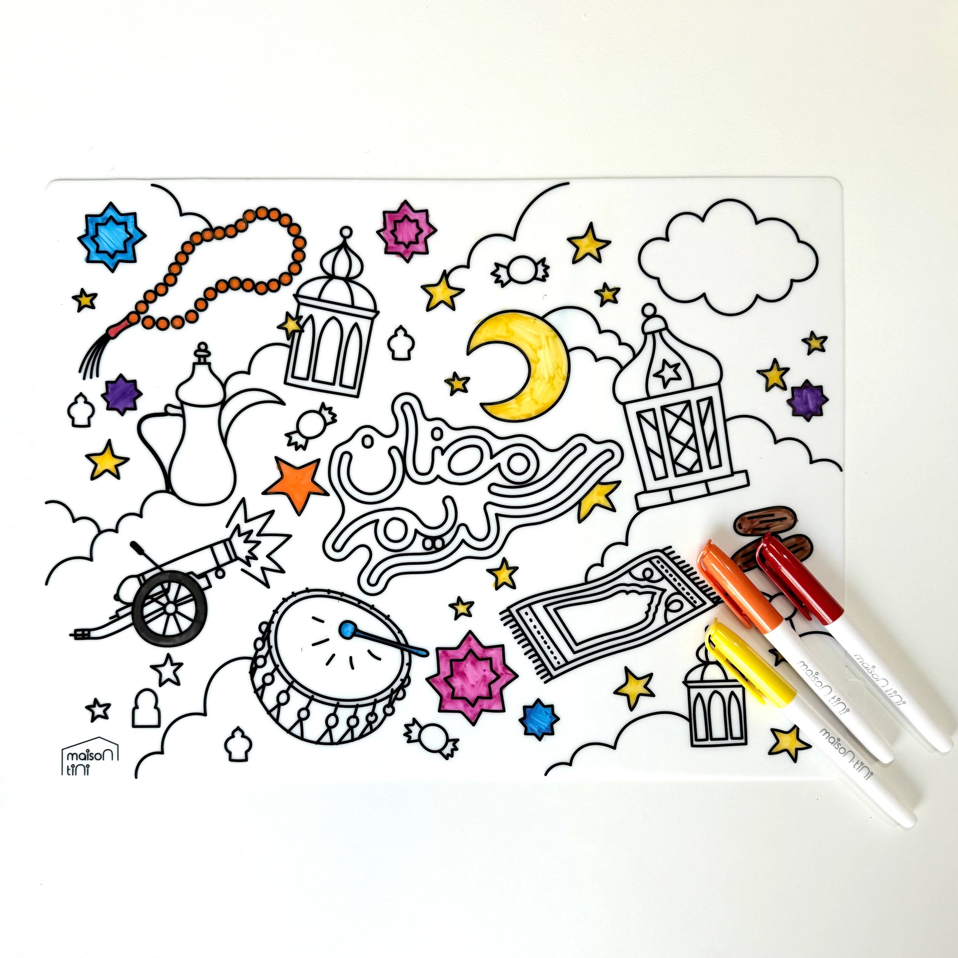 Kids Coloring Placemat in the Ramadan version! This vibrant placemat features fun ramadan icons, making mealtime an interactive and educational experience for kids. Perfect for keeping little ones entertained while teaching them about this holy month.