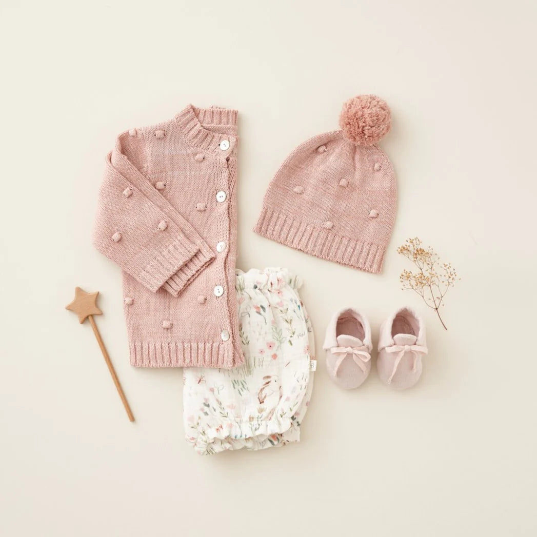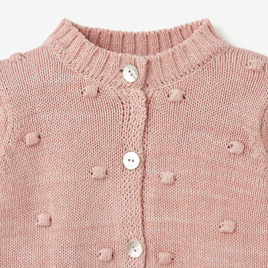 Elevate baby's sweater game with this textured, popcorn knit baby cardigan. Artfully designed in a funky 3D raised cotton knit, this knit baby sweater layers perfectly over any of our printed muslin styles.