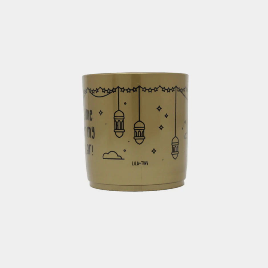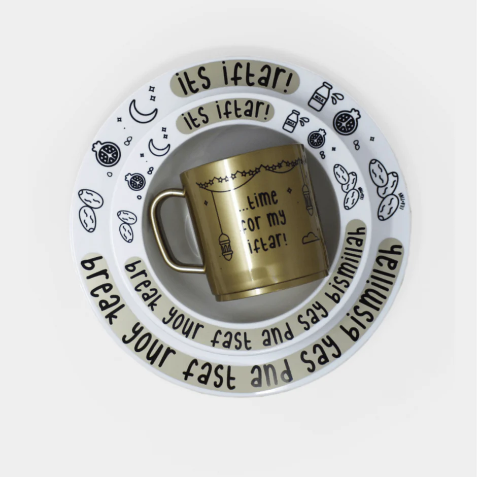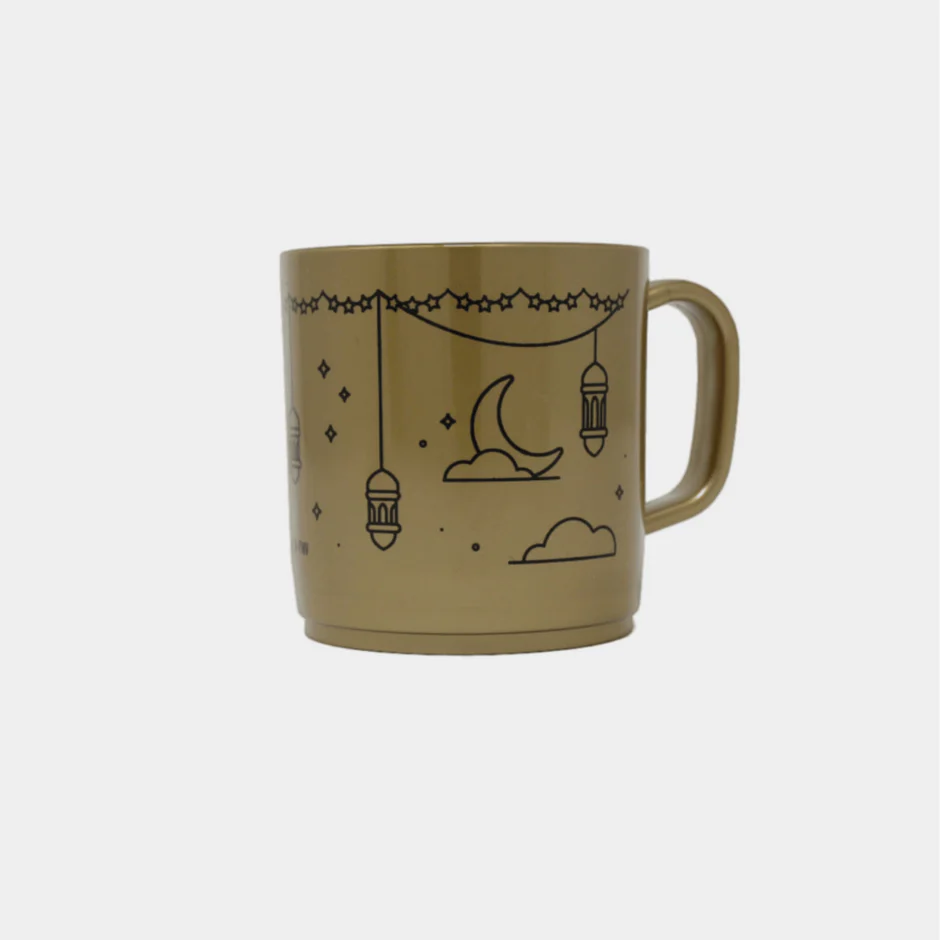 Ramadan set comes with a mug, bowl, plate specifically for children fasting during Ramadan or for simply those joining the Iftar table with the adults. The set comes with a metallic gold highlight and is playful with dates, pomegranates, milk, and a moon symbolising the importance of sunnah foods during Ramadan across the plate and bowl. The lanterns, clouds and moon on our gold mug are a cute illustration to remind of Ramadan. Make Ramadan special this year for your tinis!