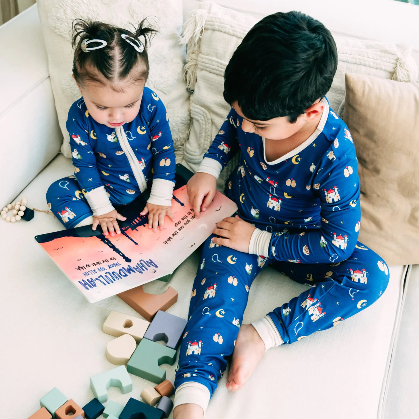 Our latest addition to the Ramadan line: buttery soft, stretchy pajamas! Perfect for bedtime cuddles and Zs, your little one will love the comfort of this Ramadanesque set. Made with bamboo fabric that is thermo-regulating, ultra-light, and irresistibly soft, your child may never want to wear anything else to bed.