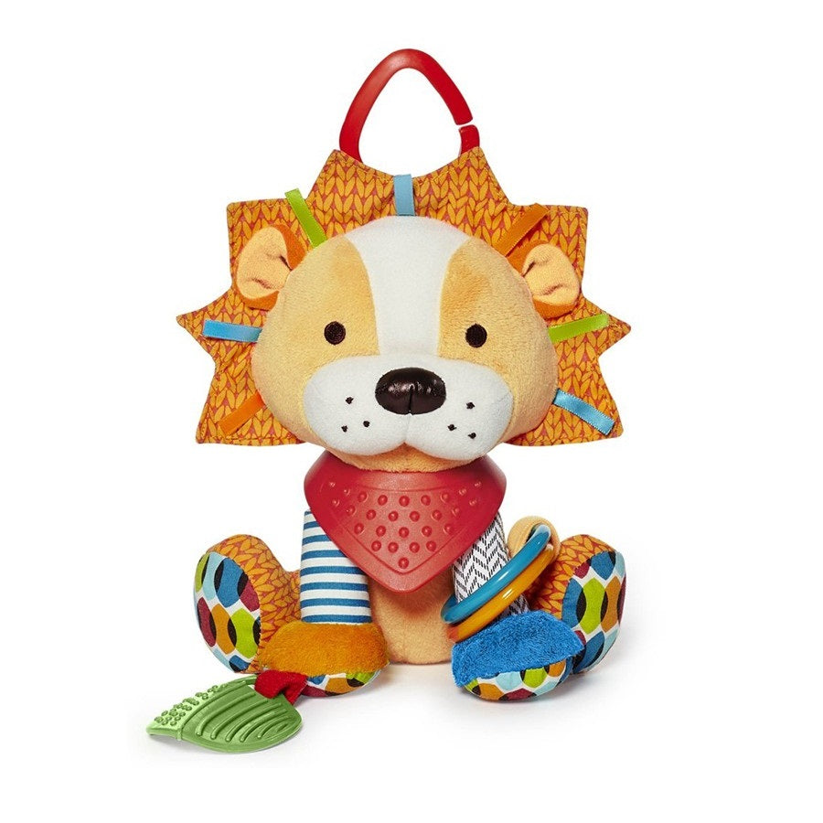 A soft toy and teether toy filled with textures, patterns and sounds! Little hands stay active as baby explores rattles, crinkles and more. This colorful character’s soft bandana teether toy detaches for mom to wear around her wrist for quick access. Perfect for multi-sensory play, this cute companion is ideal for fun at home or-on-the-go.