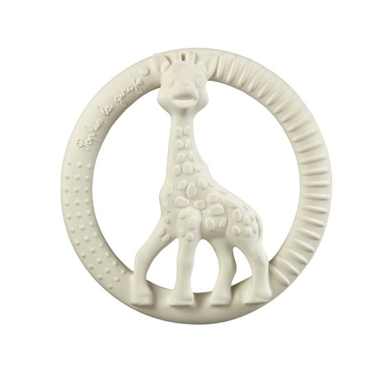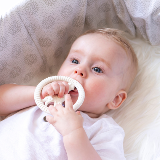 Healthy and soft, made from 100% natural rubber. Thanks to its rounded pimples and ridges, this ring relieves baby from the pain associated with teething.