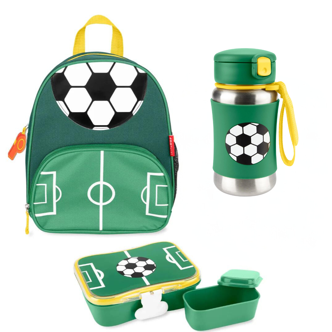 Discover the perfect combination of style and functionality with the Skip Hop Spark Style bundle, designed to make your child's day both fun and organised. This stylish set will be a fave amongst soccer fans and includes a trendy little kid backpack, an insulated food jar, and a matching lunch kit. The backpack features a contemporary design with plenty of room for books, toys, and other essentials, ensuring your child is prepared for any adventure. The bundle also includes a straw water bottle, designed with kid-friendly features like a flip-top lid and a handy wrist strap, making hydration on the go a breeze. Paired with the coordinated lunch kit, which offers ample space and an easy-to-clean interior, this bundle provides everything your child needs for a delightful and hassle-free mealtime. With the Skip Hop Spark Style bundle, your little one can enjoy practical, fashionable, and high-quality gear every day. Shop now and give your child the best in convenience and style!
