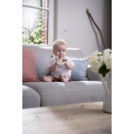 Teething ring made of 100% natural rubber from rubber tree sap, featuring Sophie the Giraffe. Very soft version for very early teething.