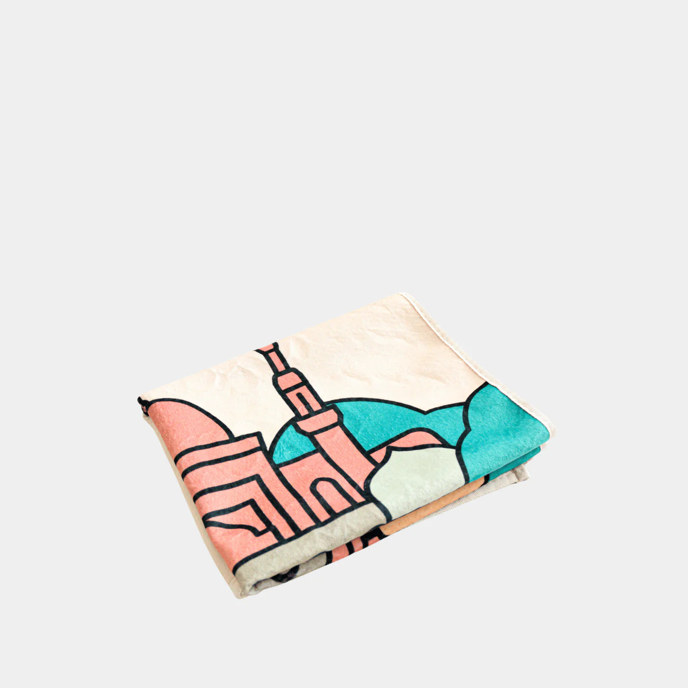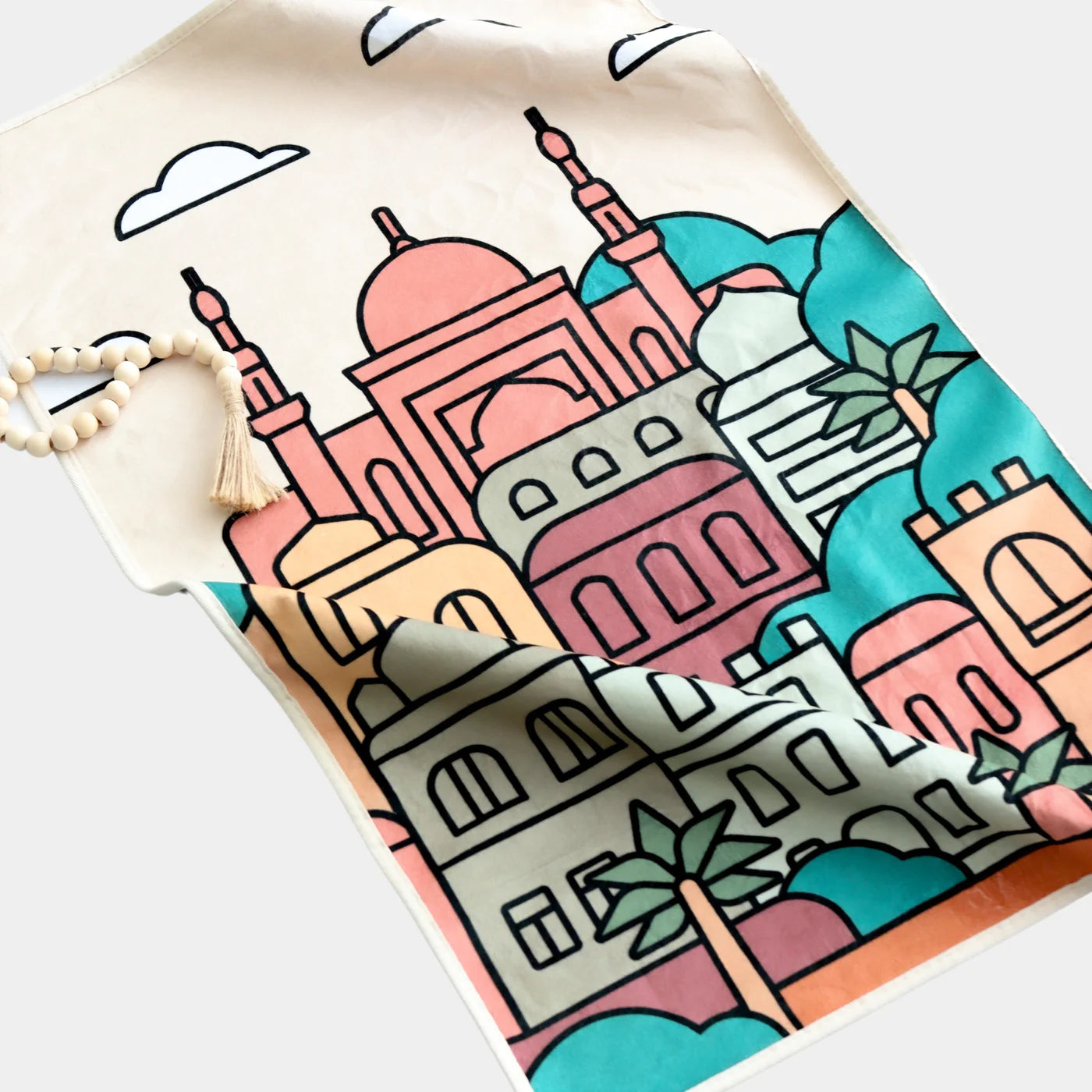 A beautifully designed prayer mat based on the town theme to encourage young children to pray. Muted tones have been used to create a soft feel visually, a perfect gift for any child.