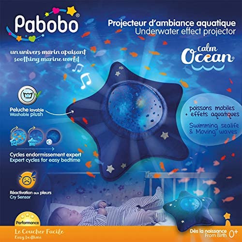 Milky Way soothe children with its moving stars projections and soft lullabies. Creates a marvelous moving starry sky that captivate baby's attention. Can choose between a soft lullaby or nature rhythms. Auto shut-off and cry sensor to turn-on if the child cries! Easily washable! (removable projector) Doesn@t heat up, even under the sheets (cold LED). Good idea by Pabobo: 3 scenarios for quiet to restless or awakened child.