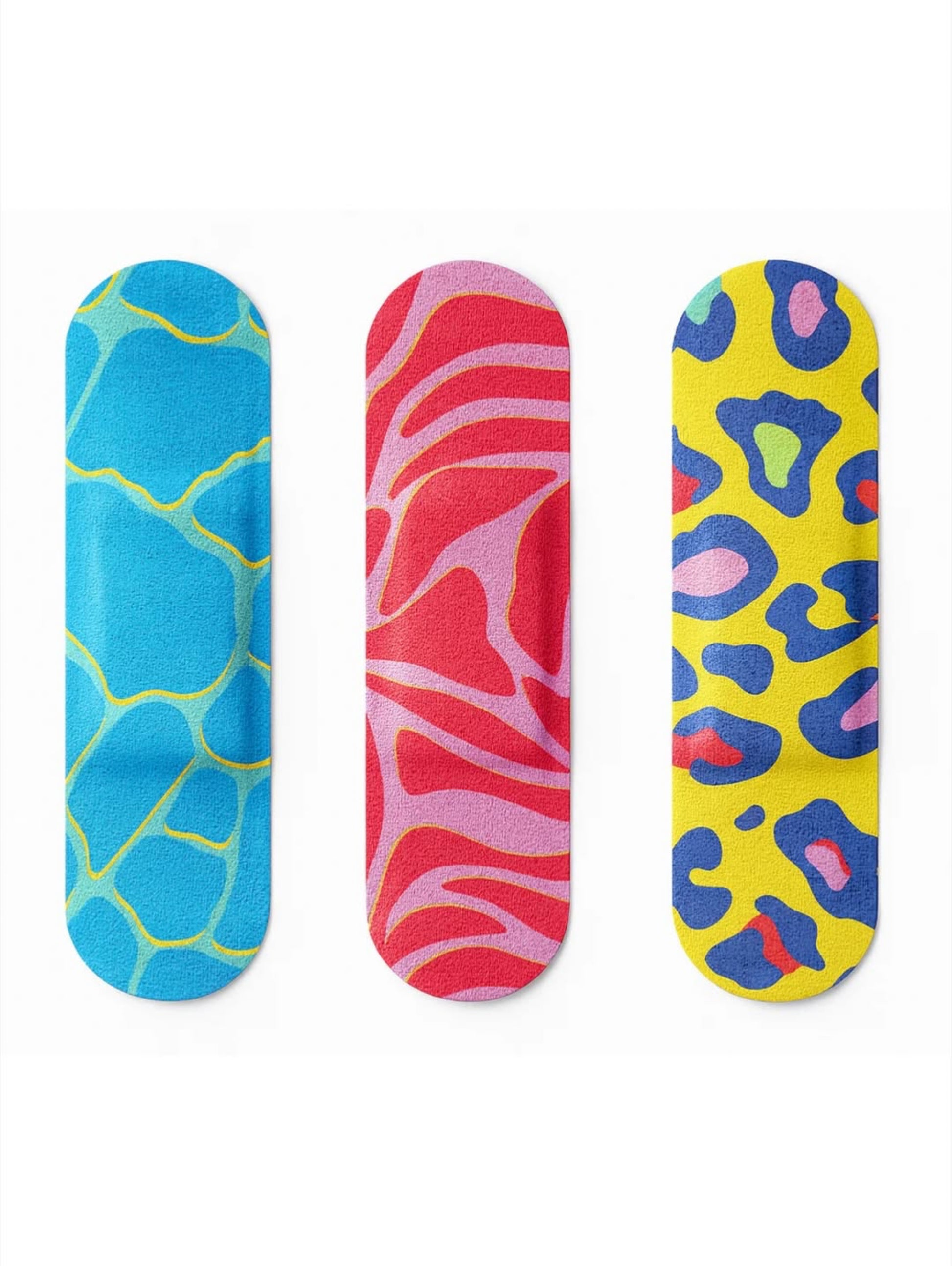 These flex fabric bandages are for our wild ones, the ones born brave! These Wawa bandages come in three funky animal prints. Featuring a playful cast of earths famous wild life! You cover the playing, we'll cover the scratch! Three funky patterns that encourage adventurers to wear bumps and cuts proudly.